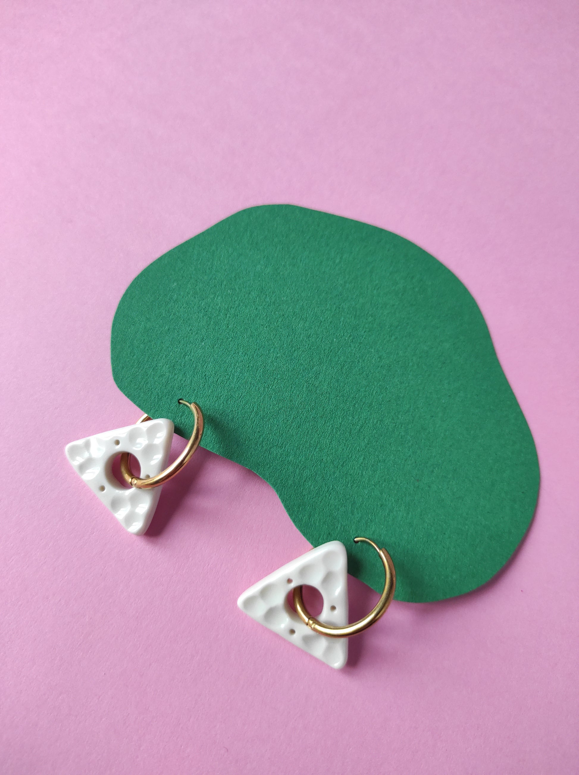 Boucles d'oreilles graphiques en porcelaine, entièrement sculptées et réalisées à la main, émaillées transparent brillant. Chaque pièce est unique.